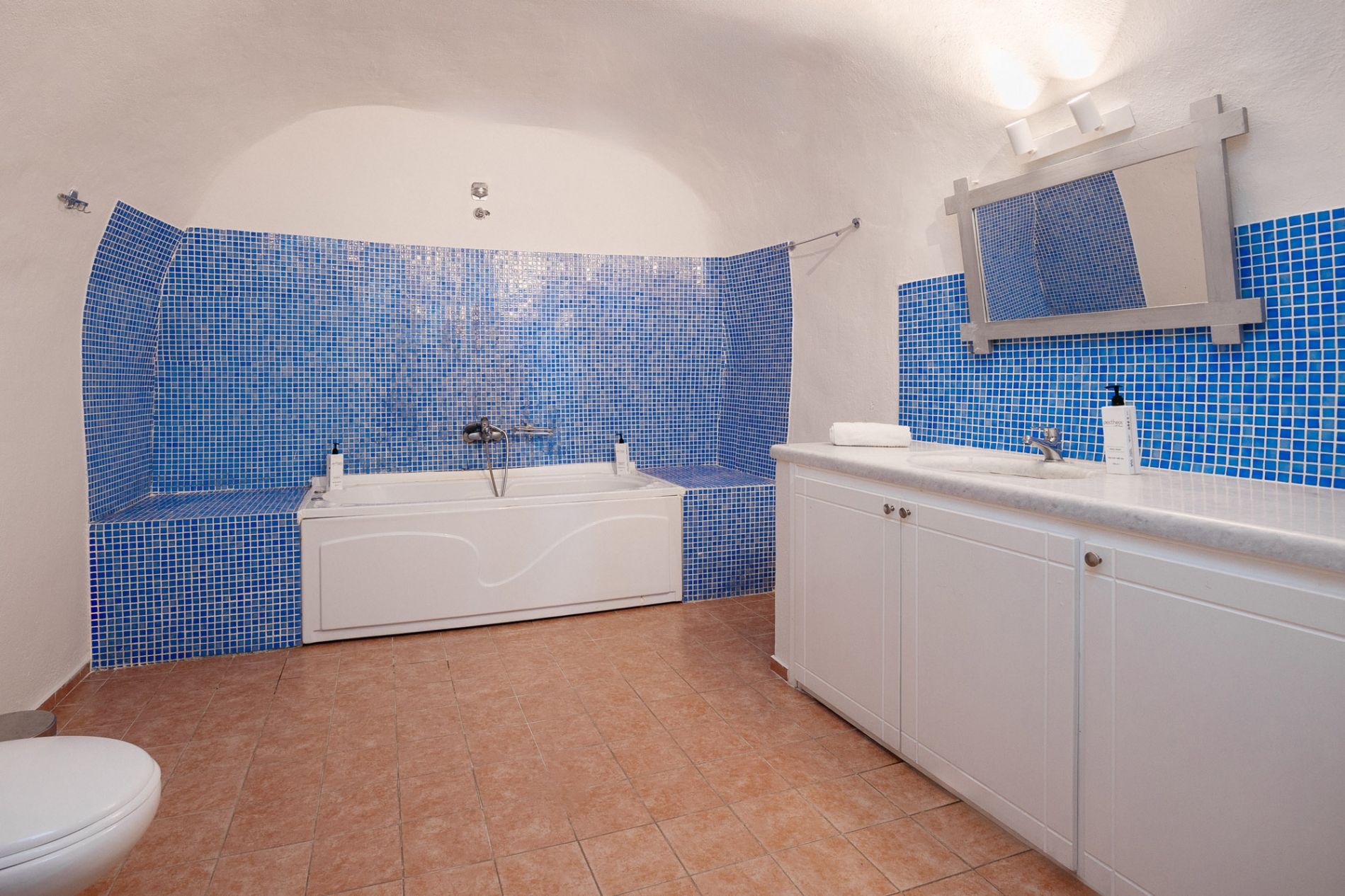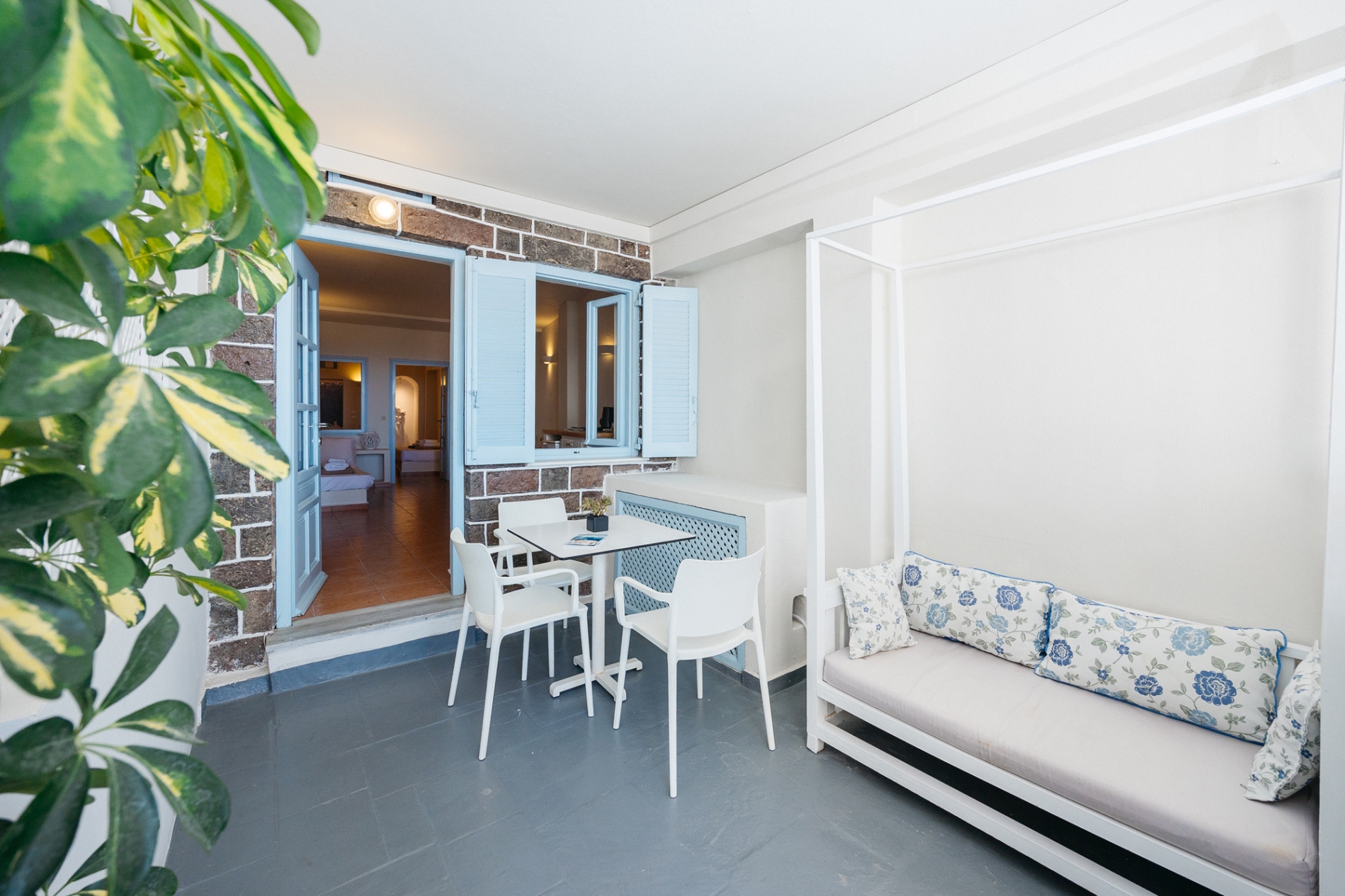 A Family Suite which consists of one bedroom with a double bed, a small living room area with a convertible couch, a spacious bathroom and a terrace with magnificent view to the Caldera and the deep Aegean blue.