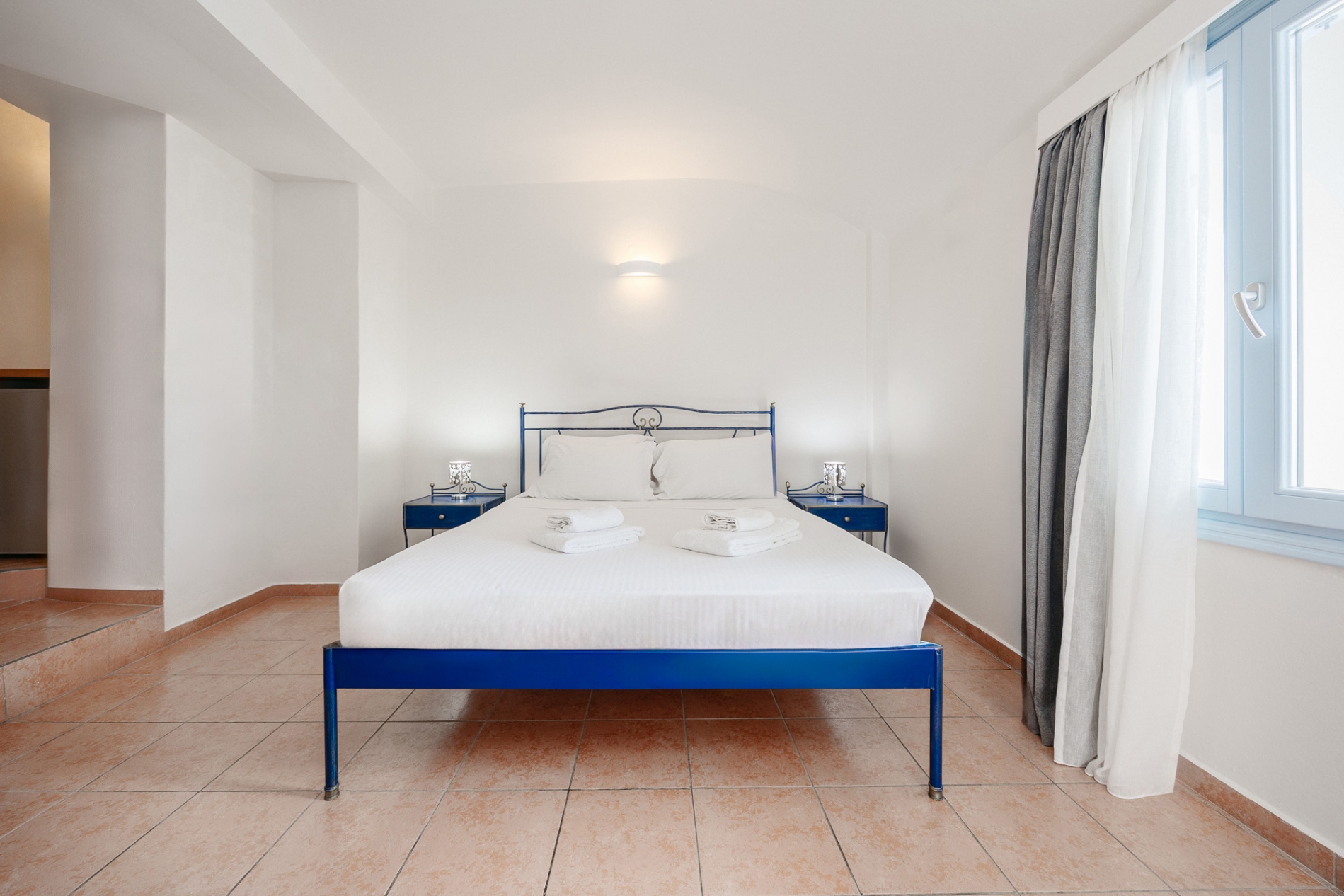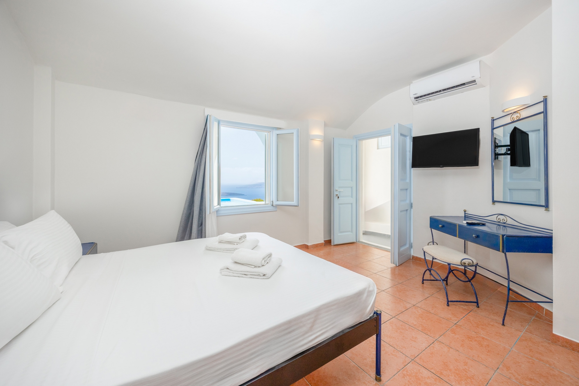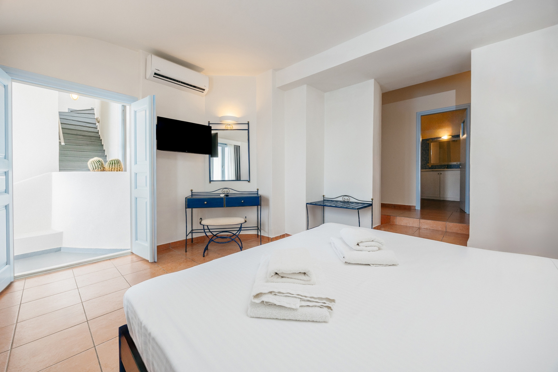 3 Junior Σουίτες (μία εκ των οποίων έχει σοφίτα) είναι ιδανικές για δύο άτομα με ένα υπνοδωμάτιο, σαλόνι με με υπέροχη θέα στην Καλντέρα και το βαθύ μπλε του Αιγαίου και ευρύχωρο μπάνιο με μεγάλη μπανιέρα.