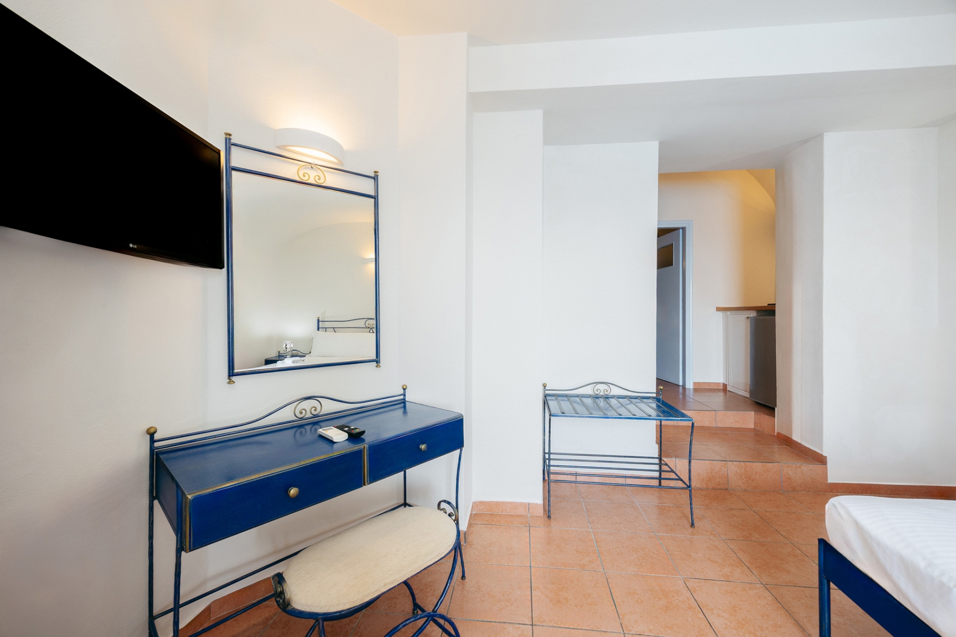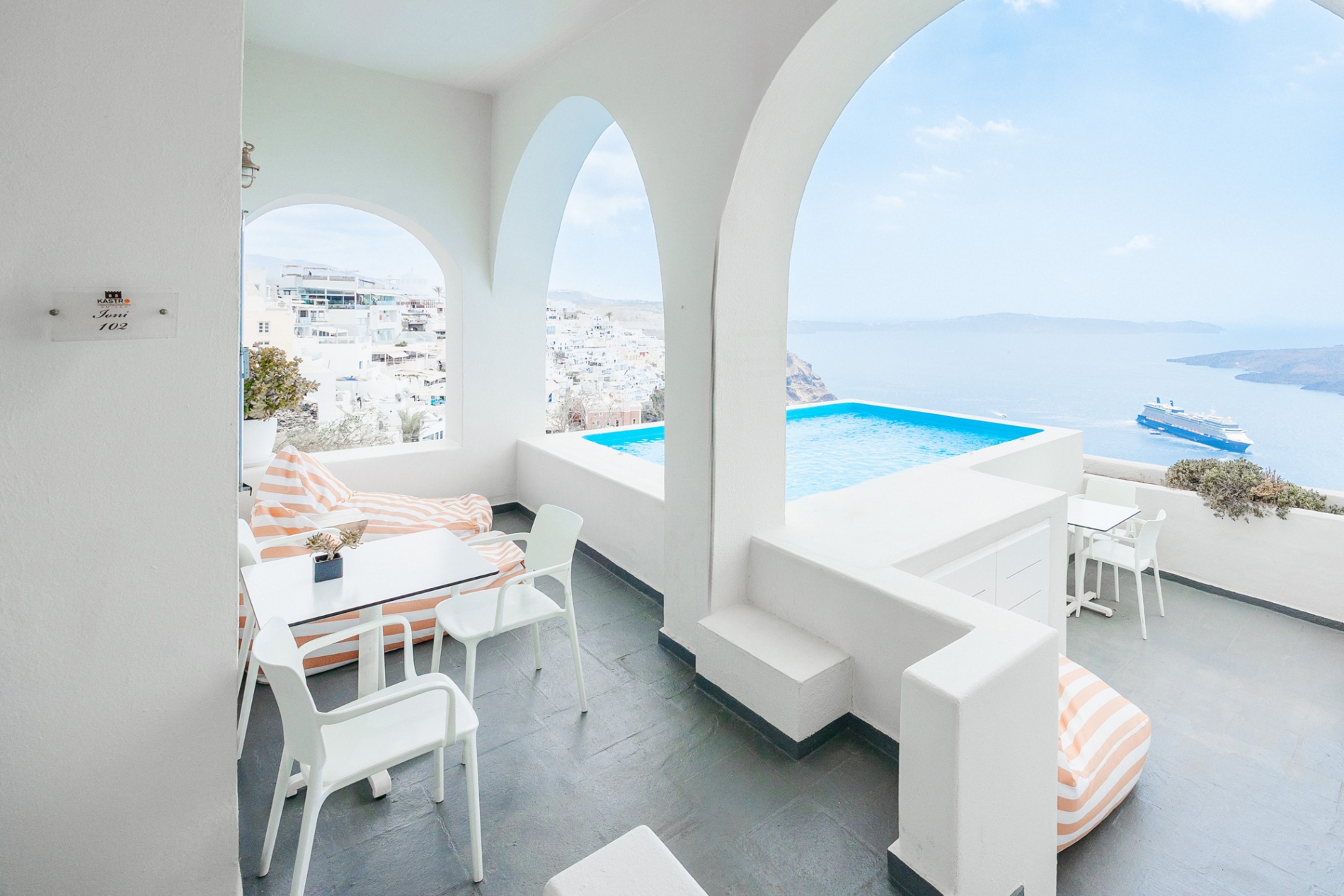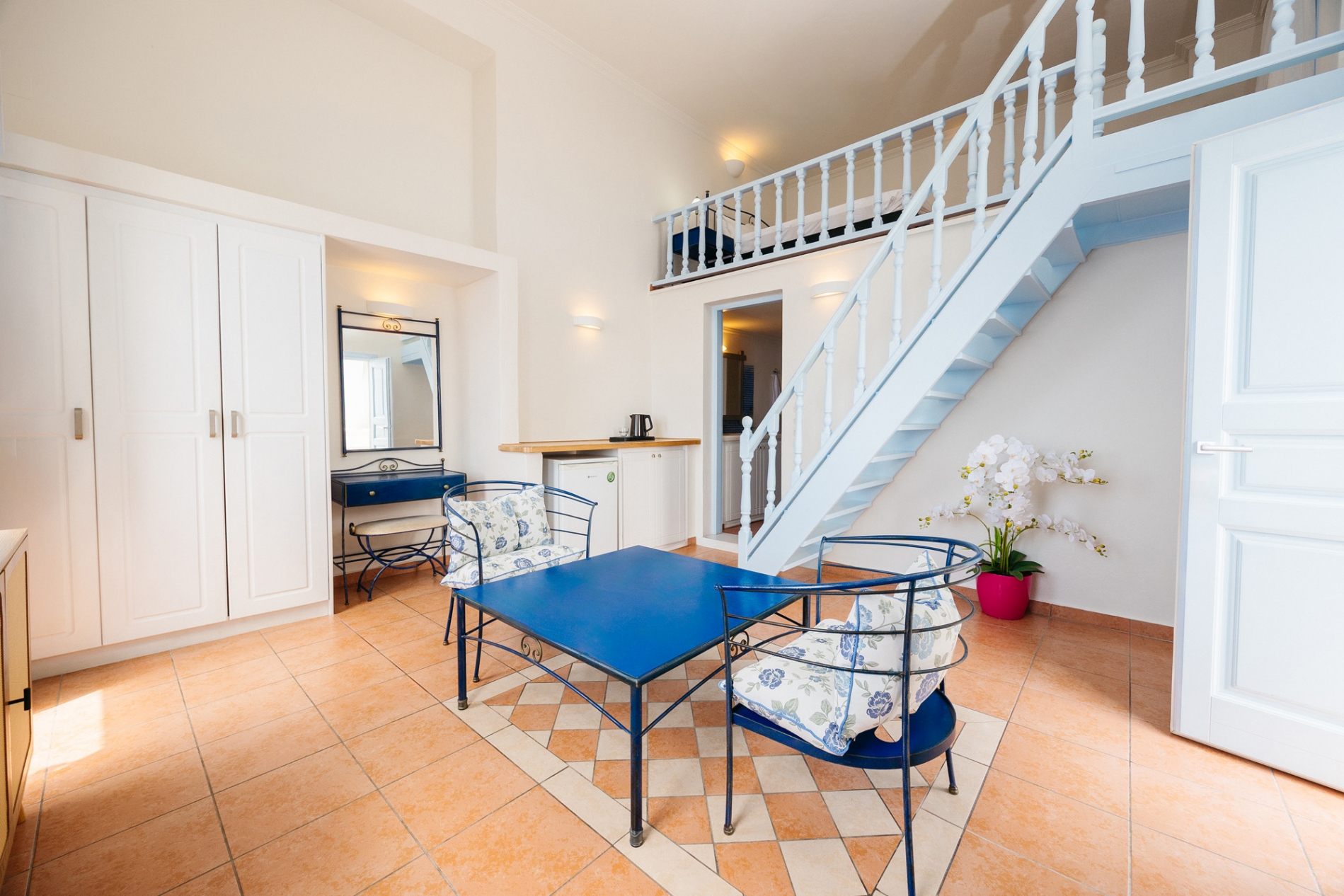 3 Junior Σουίτες (μία εκ των οποίων έχει σοφίτα) είναι ιδανικές για δύο άτομα με ένα υπνοδωμάτιο, σαλόνι με με υπέροχη θέα στην Καλντέρα και το βαθύ μπλε του Αιγαίου και ευρύχωρο μπάνιο με μεγάλη μπανιέρα.